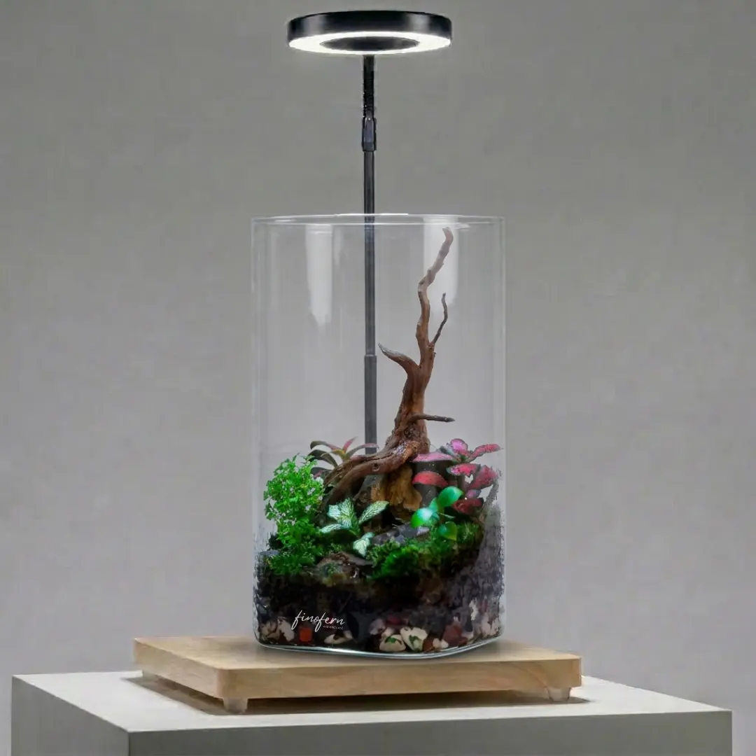 A dramatic, twisting driftwood branch reaches upward from a vibrant forest floor of moss and crimson leaves. This elegant vertical design captures the timeless beauty of a lone tree standing tall in the wild.
