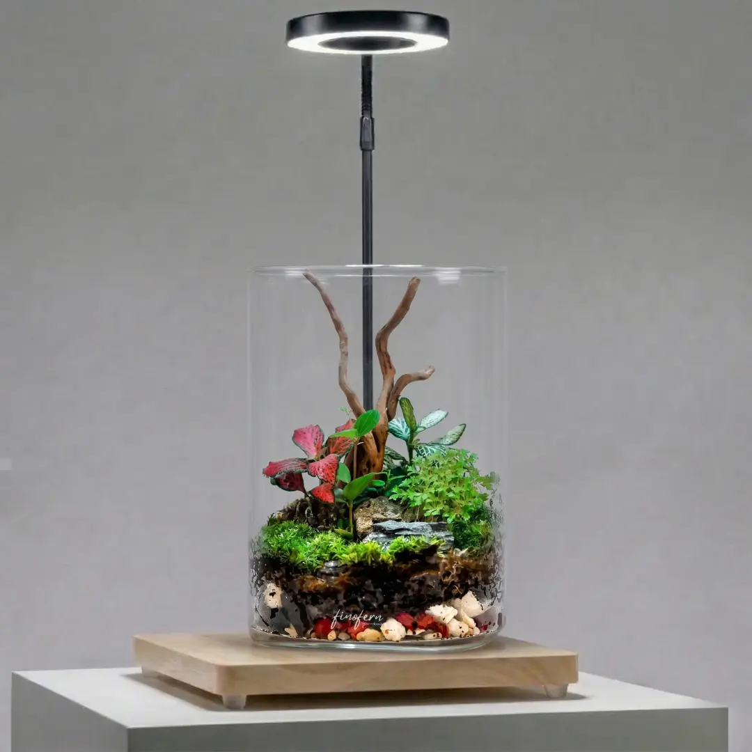Capture the stillness of a forest at daybreak with reaching we and sun-kissed red foliage. It is a serene, living reminder to find your center.