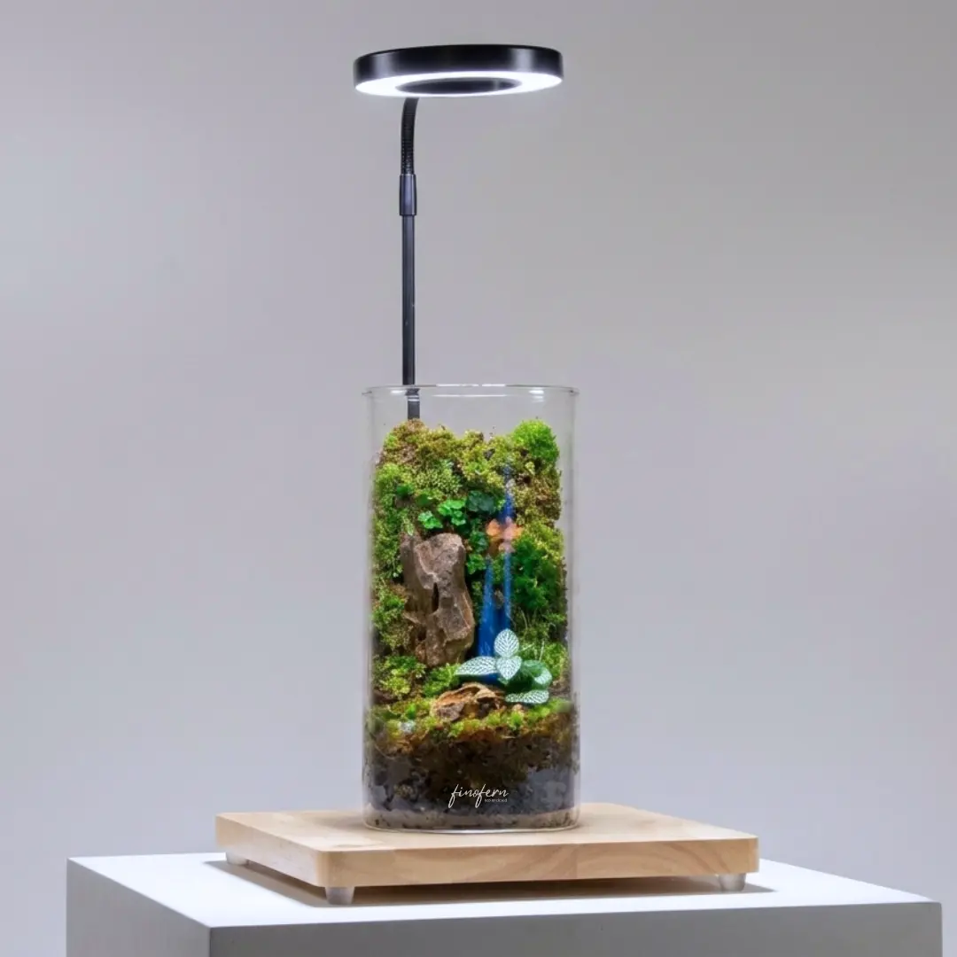 This vertical landscape features a stunning blue "waterfall" cascading down a lush wall of emerald moss and rugged stone. Housed in a sleek cylindrical vessel, it combines vibrant greenery with a serene water element to create a peaceful, miniature mountain escape.