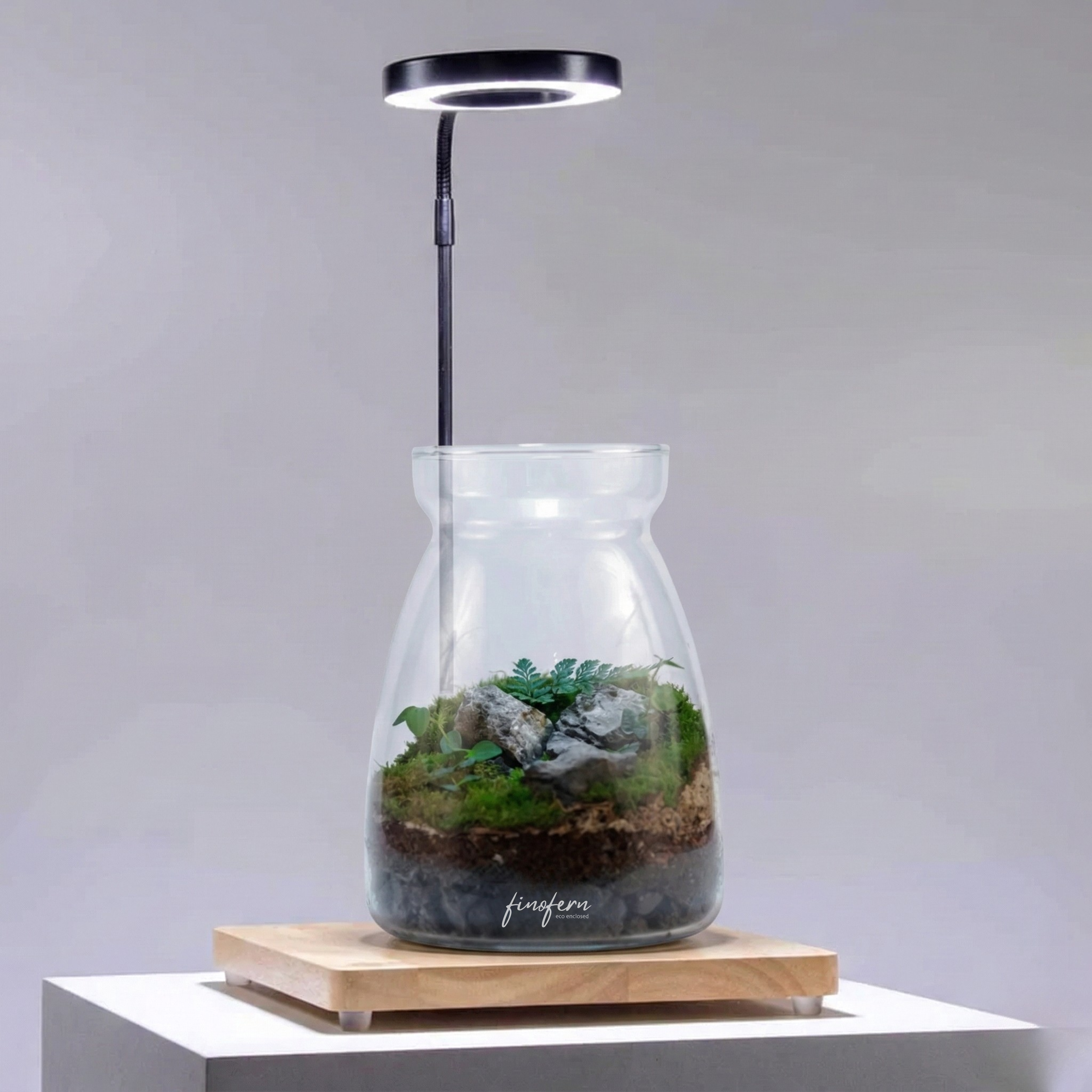 This minimalist ecosystem features a striking red-veined Nerve Plant tucked into a lush, sloping bed of emerald moss. Contained within a clear, narrow-necked glass bottle, it captures the quiet beauty of a shaded forest floor in a compact, self-sustaining design.