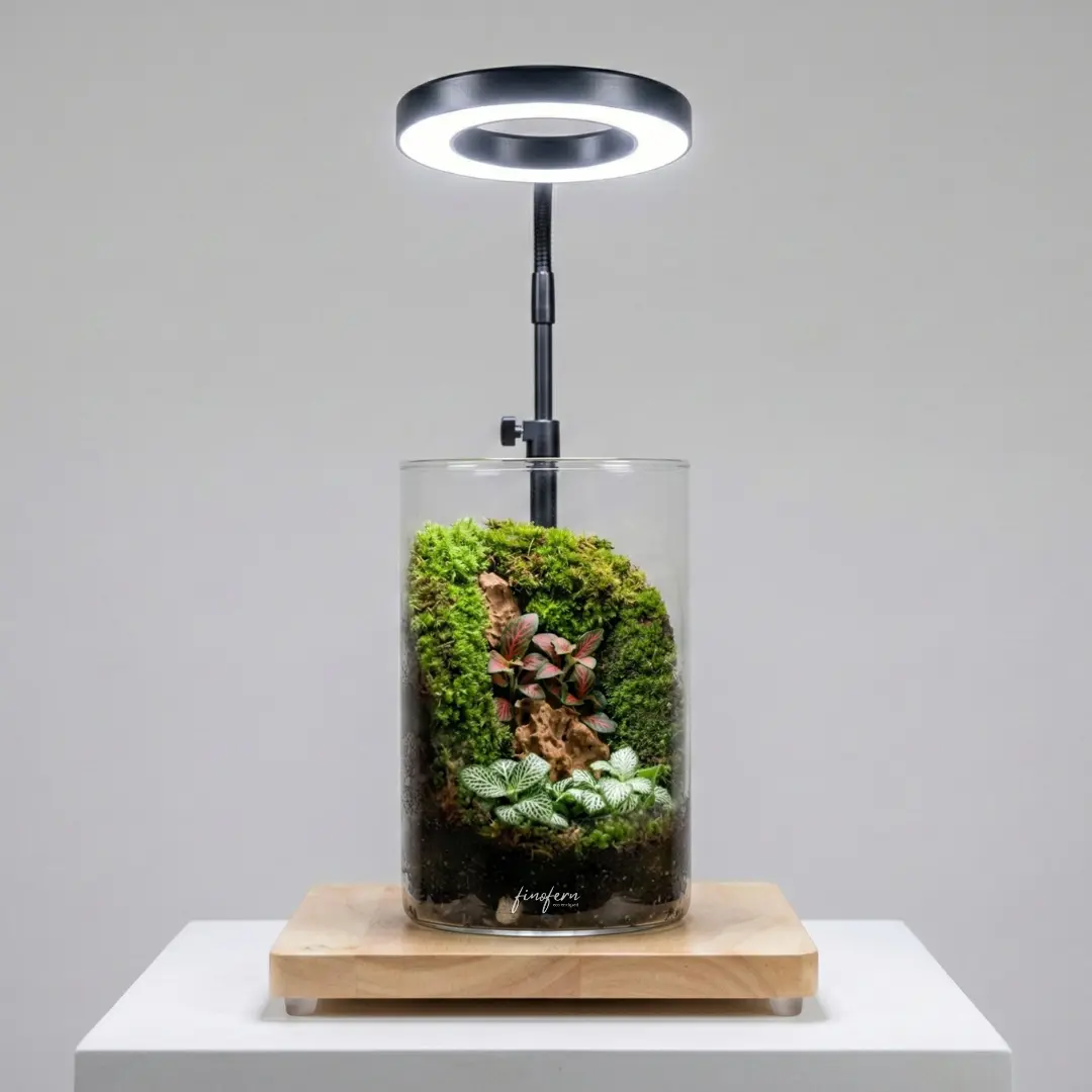 This modern cylindrical terrarium showcases a lush, vertical landscape of thick emerald moss and vibrant Nerve Plants with striking red and silver veins. The layered botanical arrangement creates a dense, multi-textured living mural that brings the depth of a tropical forest floor into a sleek, compact design.